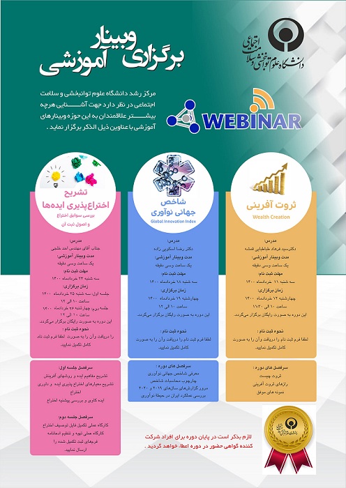 به همت مرکز رشد فناوری دانشگاه علوم توانبخشی و سلامت اجتماعی؛ وبینارهای آموزشی برای آشنایی بیشتر با مرکز رشد فناوری دانشگاه برگزار می شود مرکز رشد فناوری دانشگاه علوم توانبخشی و سلامت اجتماعی اعلام کرد: وبینارهای آموزشی برای آشنایی بیشتر علاقه مندان با ظرفیت های علمی و اجرایی مرکز رشد فناوری دانشگاه برگزار می شود. به گزارش خبرنگار وبدای دانشگاه، مرکز رشد فناوری دانشگاه، از هفته جاری سه وبینار تحت عناوین « ثروت آفرینی، شاخص جهانی نوآوری و تشریح اختراع پذیری ایده ها (بررسی سوابق اختراع و اصول ثبت آن) »، بصورت رایگان برگزار می کند. براساس این گزارش، علاقه مندان می توانند برای شرکت در وبینار " ثروت آفرینی (Wealth Creation) " تا تاریخ 11 خردادماه جاری (سه شنبه) نسبت به ثبت نام خود اقدام کنند و در این وبینار که توسط دکتر فرهاد طباطبایی قمشه عضو هیات علمی دانشگاه علوم توانبخشی و سلامت اجتماعی از ساعت 10 الی 11/30 روز 12 خردادماه جاری (چهارشنبه) برگزار می شود، شرکت کنند. این گزارش حاکیست، وبینار " شاخص جهانی نوآوری ( Global Innovation Index) " نیز که آخرین مهلت ثبت نام شرکت کنندگان را تاریخ 18 خردادماه جاری (سه شنبه) تعیین کرده، توسط دکتر رضا اسکویی زاده از ساعت 10 الی 12 روز چهارشنبه 19 خردادماه جاری برگزار می شود. همچنین، وبینار " تشریح اختراع پذیری ایده ها (بررسی سوابق اختراع و اصول ثبت آن) " که در دو بخش توسط مهندس احد خلجی از ساعت 10 الی 12 روزهای 25 و 26 خردادماه (سه شنبه و چهارشنبه) برگزار می شود، مهلت ثبت نام برای شرکت علاقه مندان را تا تاریخ 24 خردادماه تعیین کرده است. طبق گزارش مرکز رشد فناوری دانشگاه، علاقه مندان با دریافت فرم ثبت نام و تکمیل آن، می توانند در این وبینارها شرکت کرده، و در پایان دوره نیز گواهی نامه شرکت در دوره را دریافت کنند. انتهای پیام/