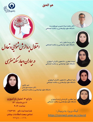 « اختلال پردازش شنوايي و تعادل در بيماران دچار سكته مغزي » وبينار « اختلال پردازش شنوايي و تعادل در بيماران دچار سكته مغزي »، روز چهارشنبه برگزار می شود وبينار « اختلال پردازش شنوايي و تعادل در بيماران دچار سكته مغزي »، روز چهارشنبه (12 خردادماه جاری) از ساعت 9 الی 12 به همت گروه آموزشی شنوایی شناسی دانشگاه علوم توانبخشی و سلامت اجتماعی و با همکاری معاونت آموزشی بیمارستان توانبخشی رفیده برگزار می شود. به گزارش وبدای دانشگاه، « اثرات سکته مغزی بر دستگاه شنوایی و تعادل، انواع اختلال شنوایی در بیماران دچار سکته مغزی، پروتكل غربالگري شنوايي در بيماران دچار سكته مغزي، توانبخشی شنوایی در بیماران دچار سکته مغزی، اختلالات دهلیزی در بیماران دچار سکته مغزی، توانبخشی دهلیزی در بیماران دچار سکته مغزی، کاربرد پوسچروگرافی در توانبخشی بیماران دچار سکته مغزی »، عناوین سخنرانی های پیش بینی شده برای این وبینار هستند. این گزارش حاکیست، علاقه مندان می توانند برای ثبت نام در این وبینار و کسب اطلاعات بیشتر با شماره تلفن 23570- 021 داخلی 149 تماس بگیرند و برای شرکت در وبینار نیز از لینک https://connect.uswr.ac.ir/avrst استفاده کنند. براساس این اطلاعیه، شنوایی شناسان با شرکت در این وبینار، از سه امتياز بازآموزي بهره مند خواهند شد. شناسه برنامه در سامانه آموزش مداوم نیز، 165378 می باشد.