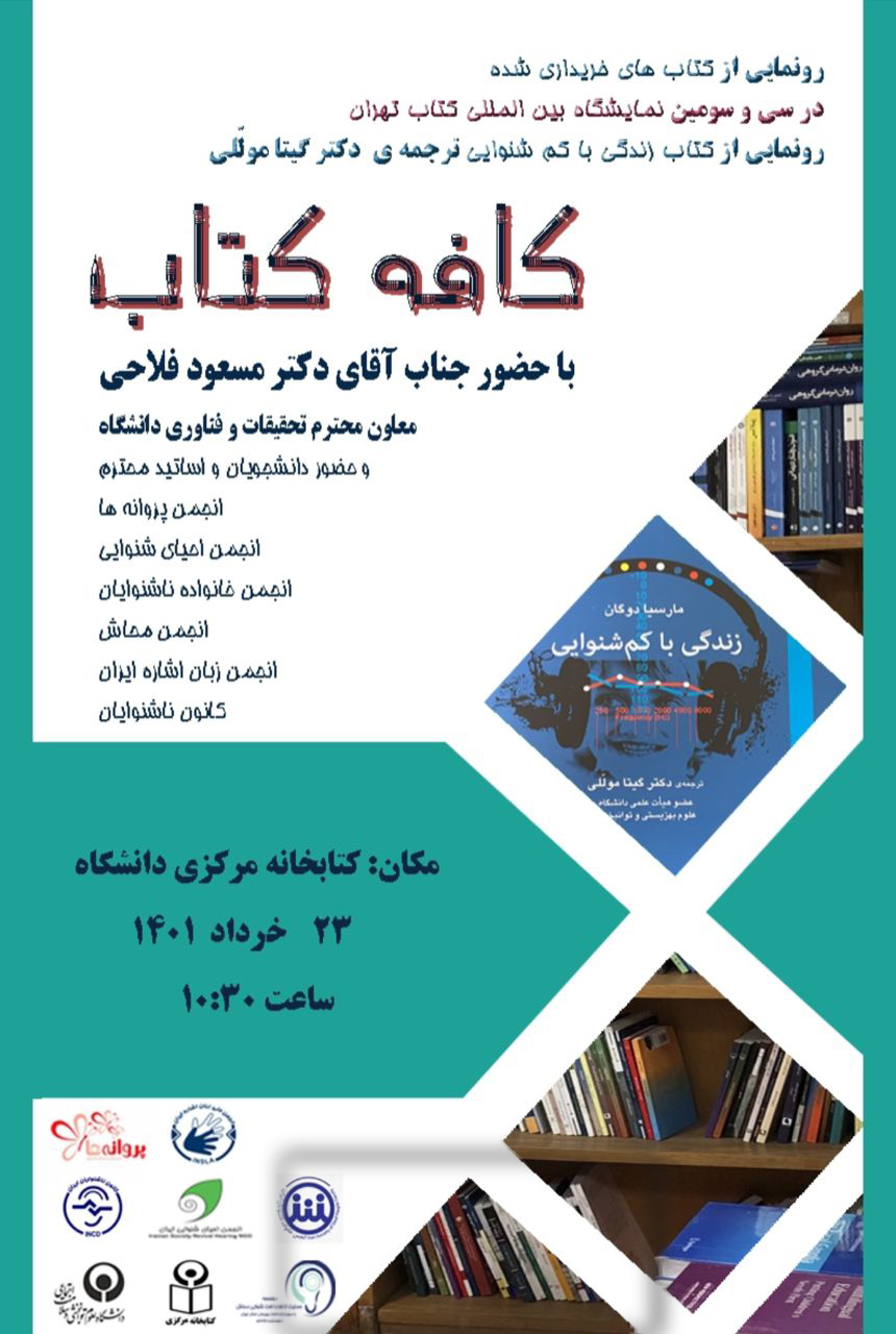 به گزارش وبدای دانشگاه، کافه کتاب دانشگاه علوم توانبخشی و سلامت اجتماعی، ساعت 10/30 روز دوشنبه 23 خردادماه جاری، با حضور دکتر فلاحی معاون پژوهشی دانشگاه، جمعی از اساتید و دانشجویان دانشگاه و همچنین نمایندگان چند انجمن و کانون حمایتی مرتبط با کم شنوایی مانند انجمن های پروانه ها، احیای شنوایی، خانواده ناشنوایان، محاش، زبان اشاره ایران و کانون ناشنوایان، در محل کتابخانه مرکزی دانشگاه برگزار می شود.